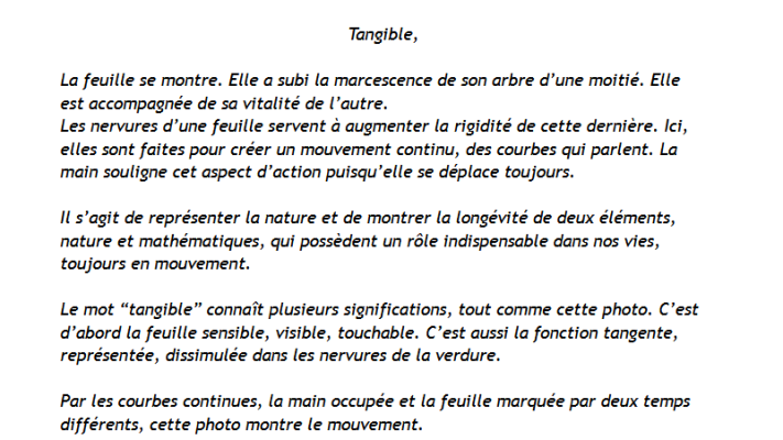 Ils sont trois. Ils sont en classe de 1ère générale. Accompagnés par Mme Muller, leur professeure de mathématiques. Ils ont participé au concours « L’œil des maths » : des créations illustrant la diversité des domaines mathématiques. Découvrez ici les photographies d’un verre remplie d’eau en mouvement, une composition IA relatant l’évolution des sciences et un dessin de feuille dont les nervures représentent la fonction Tangente