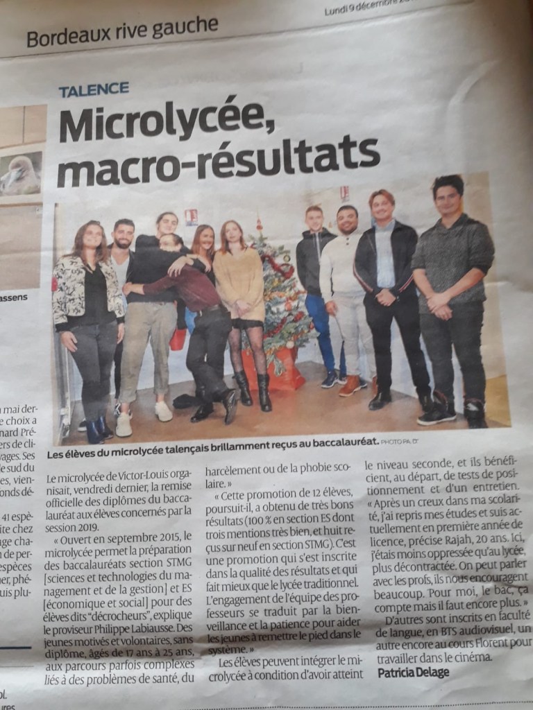 Article du Sud Ouest qui fait honneur à cette belle promotion 2019 ! Les nouveaux bacheliers, anciens élèves du micro-lycée sont revenus sur la structure le temps d’une soirée ! Partager : Cliquer pour partager sur X(ouvre dans une nouvelle fenêtre) X Cliquez pour partager sur Facebook(ouvre dans une nouvelle fenêtre) Facebook J’aime chargement… Similaire