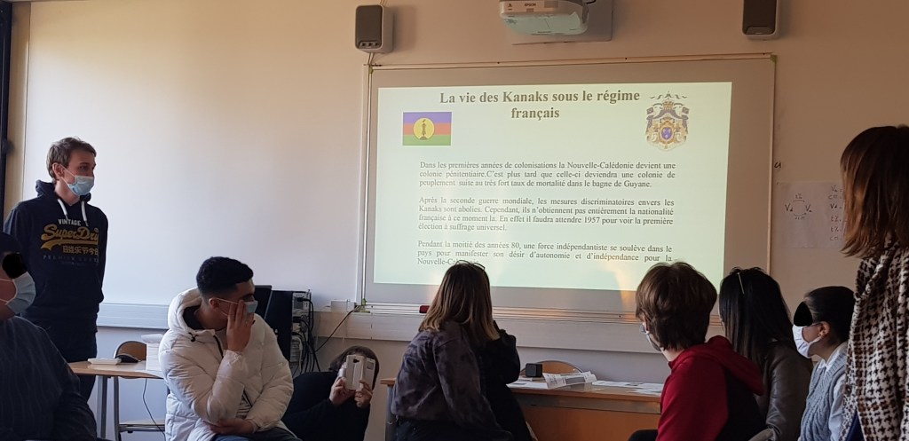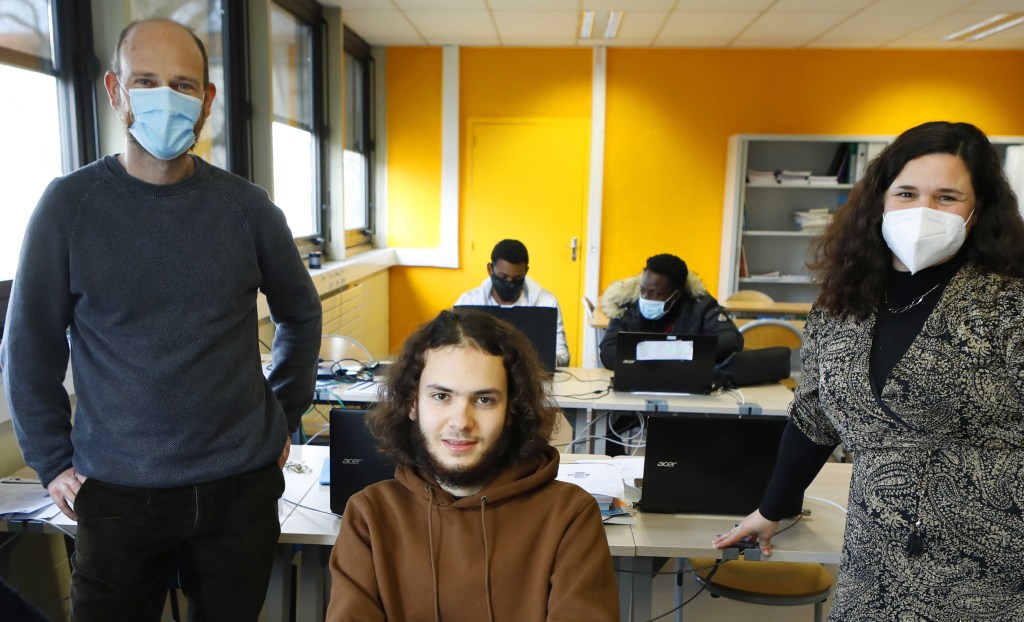 (Enseignant Coordinateur STMG Micro lycée) , Aïssa HAZY , Mélanie ARBULE-GUEYE (Coordinatrice MLDS Micro lycée de Talence) en fond les camarades de classe d’Aïssa, Yoann et Paul Patrice