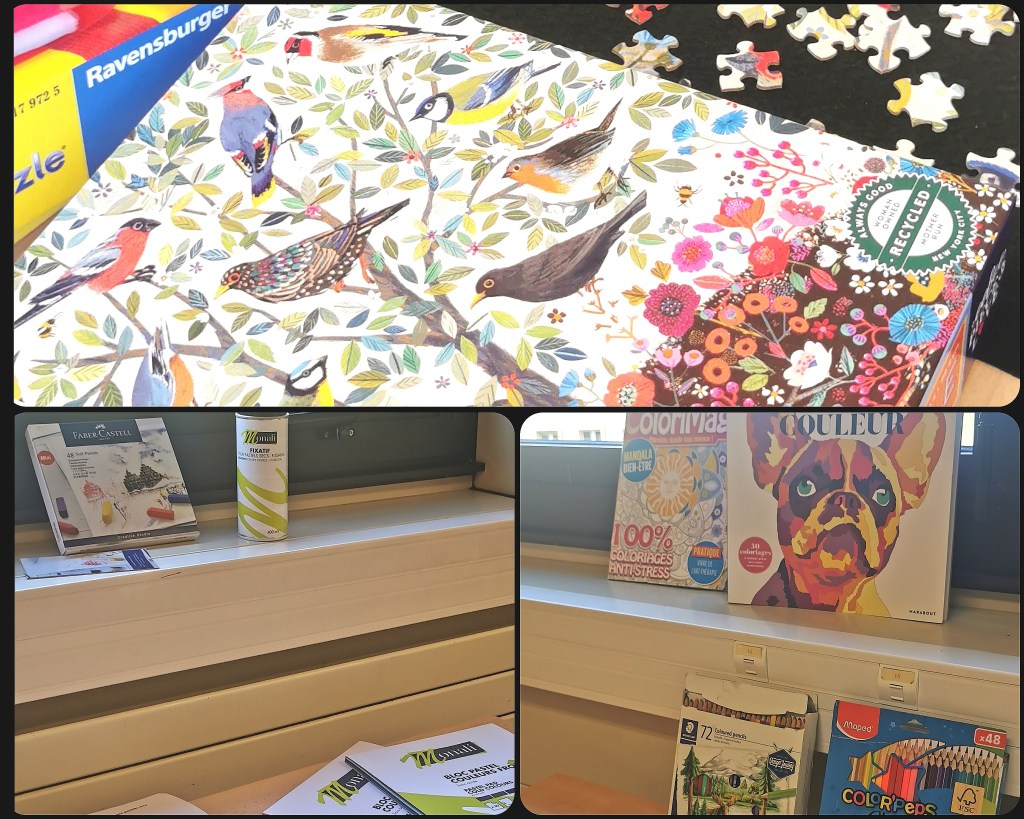 Un puzzle, des pastels secs, des coloriages
