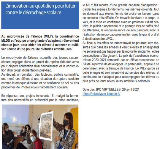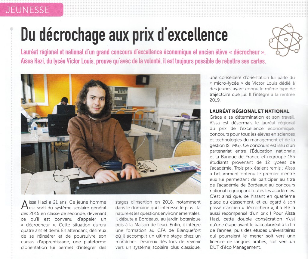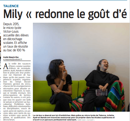Les médias parlent de nous ! retrouvez ici tout ce qui se dit sur le Micro-lycée. Retrouver l’article dans le Sud-Ouest ici https://www.sudouest.fr/2021/01/15/talence-33-aissa-hazi-remporte-le-prix-de-l-excellence-economique-pour-les-eleves-de-stmg-8291104-2780.php Inauguration du 2ème micro-lycée public de l’académie au lycée Victor Louis à Talence (03/09/2015) Les débuts du Microlycée sur France3 (rentrée 2015) Article sur le quotidien du micro-lycée par Aqui Partager : Cliquer pour partager sur X(ouvre dans une nouvelle fenêtre) X Cliquez pour partager sur Facebook(ouvre dans une nouvelle fenêtre) Facebook J’aime chargement…